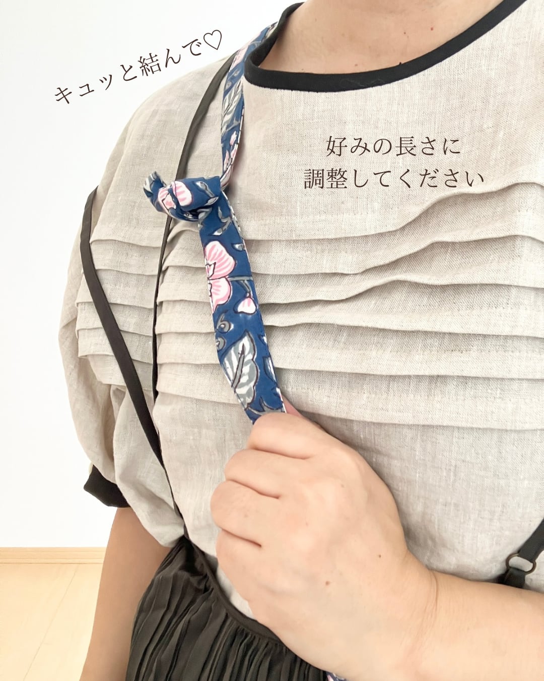 ショルダー紐は長くしてますので、結んで長さを調整してください。